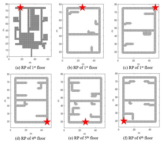 If the user phase is one, the CLD module is operated. CLD is an algorithm that finds a user’s floor using only the IDs of the nearby BLE beacons received from a smartphone. Because it is difficult to accurately estimate the user’s floor with only the BLE ID, two or three floor candidates are determined. CLD uses shot scan data and quickly determines the floor. Figure 13 displays the CLD request positions on each floor. A total of 10 CLD tests were performed at corresponding locations on each floor. CLD calculates the probability that a user is on each floor based on the received BLE ID. Under the premise that the user receives the BLE module installed on the current floor the most, the probability is calculated using the BLE beacon information installed on each floor and the currently received BLE ID vector.