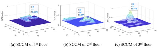SCC represents the degree of similarity between the short URS and radio map. In particular, although the maximum probability of CLD on the third and fourth floors of D1 was incorrectly estimated for the second and fifth floors, respectively, it was confirmed that the floors were accurately estimated through FLD. This shows that the coverage of the BLE beacon reaches several floors of the building; however, the current user floor is clearly estimated through the RSSI. Figure 14 shows the SCCM calculated by performing FLD on the third floor using D1. The first, second, and third floors were returned through CLD calculations. The maximum value of SCCM calculated after comparing the radio map and short URS of each floor is shown in Figure 14. Because the ratio between the maximum SCC value of the third floor and the maximum SCC value of the second floor is higher than that of the FLD threshold, the current user floor of the building is fixed to the third floor, and the user phase is updated to the next phase.