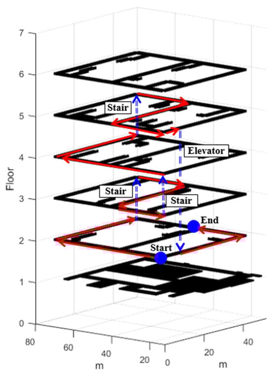 To verify the performance of the proposed technology in a multistory building, we performed a test, as shown in Figure 15. The experimenter moved from the second to the fifth floor through the stairs and moved from the fifth to the second floor using the elevator. When a user moves between floors, the floor change is immediately determined using an LCD.