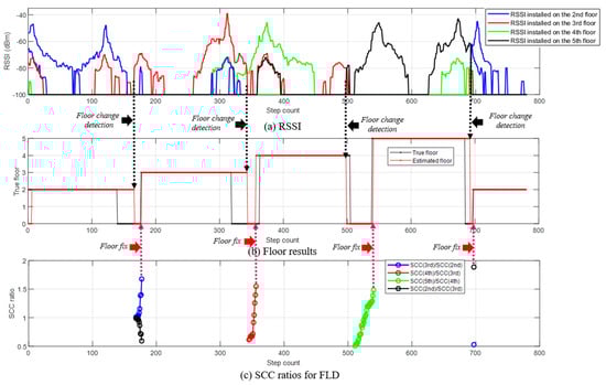Floor estimation results. LCD detects the user movement between floors by checking the current floor and maximum RSSI signal. FLD calculates the SCC and determines the floor when the SCC ratio exceeds the FLD threshold.