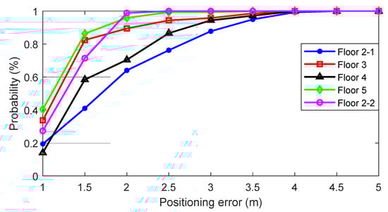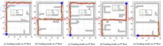 Figure 18 shows the cumulative density function of FLT results on each floor. Through this graph, it can be seen that FLT accurately tracks the user’s location. It shows that the location error converges to less than 3 m with a 90% probability on all floors. Table 6 summarizes the positioning performance analysis results for each floor.
