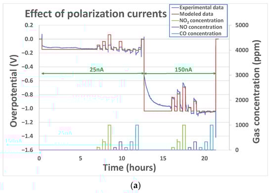 In contrast to the case with base gas only, for which no clear influence of polarization was observed, the couple , seems to be different according to polarization voltage for the tested pollutant analytes. This means that the polarization voltage influences the order of reactions and constant rates. Indeed, as can be seen from the example of Figure 9a), the parameters that have been adjusted for the polarization current of 150 nA are not relevant for a polarization voltage of 25 nA. Indeed, they do not enable a correct fitting of the sensor’s output when the analyte concentrations are varied. Besides, the charge transfer coefficient , which is, by definition, not supposed to vary with polarization current, has been considered fixed for one analyte. A correct fitting of the experimental curve (Figure 9b)) was obtained while allowing the couple and to vary according to the polarization current. Parameter-fitting results obtained for the three tested sensors at polarization currents of 25 nA, 50 nA, and 150 nA have been summarized in Table 2 for NO2, NO, and CO analytes.