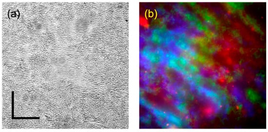 (a) Brightfield and (b) widefield epifluorescence images (composite of 405/440 (blue), 488/520 (green), and 560/605 (red) (excitation/emission filter central wavelength)) of a thin S. aizunensis sample (~3 µL of sample sandwiched between a microscope slide and cover slip), showing the filaments formed in the cultures. The strong scattering from this sample causes a significant blur, even when the focal plane is directly below the cover slip. Scale bars: 100 µm.
