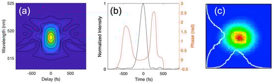 Characterization of the output beam from our femtosecond fiber laser. The pulses were characterized using second-harmonic frequency-resolved optical gating (a,b), showing a pulse duration of 180 fs with minimal satellite pulses. (c) The far-field beam profile, measured with a beam profiler camera. The profile is nearly perfectly Gaussian, owing to only the fundamental mode being launched in the large-mode area final amplifier stage.