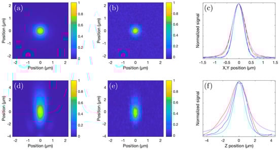 We experimentally estimated the three-dimensional 2P and 3P PSFs using a microscope slide with sub-micrometer-sized beads, each labeled with four different fluorophores (TetraSpeck, Invitrogen, Waltham, MA, USA). The blue (365/430 nm (single-photon excitation/emission wavelengths)) fluorophore was used to determine the 3P PSF, and the orange (560/580 nm) fluorophore was used to determine the 2P PSF. Stacks of x–y images with the orange and blue fluorescence recorded simultaneously were acquired from 500 nm diameter beads, with each acquired plane separated by 250 nm (see Figure 5a–d). The measured x-, y-, and z-projections agreed well with the calculated shape of the focus of a 1040 nm beam with a minimal beam waist (1/e2 radius) of 0.55 µm, taking into account the 500 nm size of the beads. Theoretically, when overfilling the back aperture of a 1.05 NA objective, the focal spot size (1/e2 radius, w0) of a 1040 nm (λ) beam would be about 0.4 µm. Our measured focus was larger, as our beam size did not overfill the back aperture of the objective (owing to the 5 mm aperture of the scanning mirrors and four-fold magnification offered by the scan lens–tube lens pair). Figure 5d,e show the PSFs of the focused beam along the beam propagation direction for 3P and 2P fluorescence. The lateral 1/e2 radius of the 3P PSF is 0.32 µm, and for the 2P PSF, it is 0.39 µm.