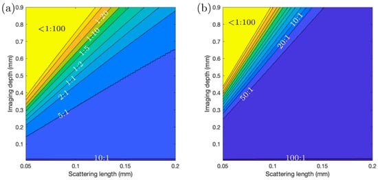 Simulated signal-to-background ratio vs. scattering length and imaging depth for (a) 2P excited fluorescence and (b) 3P fluorescence. Contour lines (iso-values for signal-to-background ratio) and color coding are the same for both panels. Contour lines are labeled where possible. Beyond a signal-to-background ratio of 1:20, contour lines are drawn at 1:50 and 1:100. Obviously, those last contours represent situations where image quality is so gravely compromised that imaging is practically impossible.