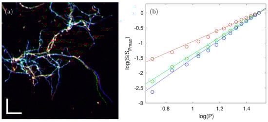 For imaging purposes, signals from S. aizunensis were collected in three different spectral windows, as described above. It must be noted that no exogenous labeling was applied; thus, the signal relied only on the natural fluorescence from the sample. The three-color image of a ~30 µm thin sample with an ensemble of signals from Streptomyces filaments is shown in Figure 7a. This sample was used to obtain a power dependence of the fluorescence signal in each of the three spectral windows, in order to reveal the (dominant) nature of the excitation of the fluorescence in each channel. A logarithmic plot of the signal in each of the spectral windows (divided by the signal obtained at the highest power used) vs. the excitation power for each of the detection channels is shown in Figure 7b.