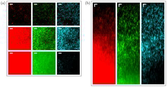 Measurement of 2P and 3P fluorescence vs. depth (76 µm × 76 µm × 270 µm) in a dense Streptomyces bacterial community sample. (a) Red (570–640 nm), green (490–560 nm), and blue (400–480 nm) fluorescence channels (Top row—xy slice 10 µm below top surface. Middle row—xz slide 160 µm below top surface. Bottom row—xy slice 270 µm below top surface. Scale bar: 10 µm.). (b) Center xz cut; scale bar: 10 µm.