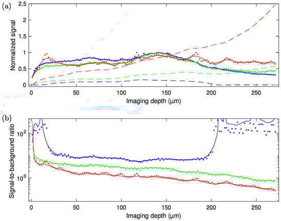 (a) Signal minus background vs. depth corresponding to the stack shown in Figure 7, normalized to maximum value (close to 150 µm depth; solid dots and lines) and, accordingly, scaled background vs. depth (dashed lines) for the red, green, and blue channels. (b) Signal-to-background ratio vs. depth for the red, green, and blue detection channels.