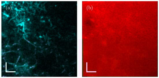 Images (76 µm × 76 µm) obtained at 780 µm below the sample surface in a medium-dense sample (with 120 µm effective attenuation length), i.e., at 6.5 scattering lengths below the surface; (a) 3P excited fluorescence signal detected in the 400–480 nm spectral window; (b) 2P excited fluorescence signal detected in the 570–640 nm spectral window. Streptomyces filaments are clearly recognized in the 3P image but cannot be resolved in the 2P image due to the overwhelming background. Scale bars: 10 µm.