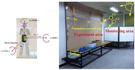 This system uses data from a single accelerometer and gyroscope embedded in a smartphone attached to the back of a worker’s vest (close to the waist area), as shown in the left of Figure 1, to detect falls and the related portents. An experiment was conducted in which a tiling operation was performed in a simulated scaffolding inside a laboratory, as shown in the right of Figure 1.