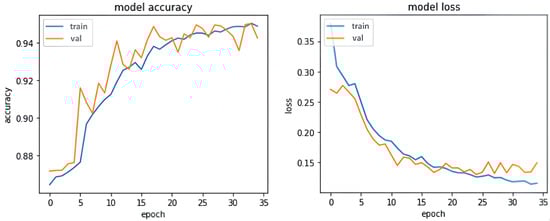 Among the 30 participants, the data of 25 randomly selected participants were used to train the model, and the rest of the data were used to test the trained model. Figure 3 shows the accuracy and loss of the model during the training and validation phases.