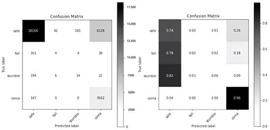 Figure 4 shows the results of the model in terms of time-unit data in the form of the confusion matrix of GRU-S as numbers (left) and the corresponding percentages (right). For example, for the safe label, the accuracy percentage is 0.94 (=23292/(23292 + 8 + 8 + 89 + 1278)). For the target alarm labels of fall, stumble, and coma, the accuracies were 0.88, 0.47, and 0.72, respectively. Figure 5 shows the confusion matrix of the previously developed HER-S for the same set of data. For the target alarm labels of fall, stumble, and coma, the accuracies are 0.02, 0.06, and 0.96, respectively. Apparently, GRU-S performed better than HER-S in accurately detecting the fall and stumble, but its performance was poorer for coma.