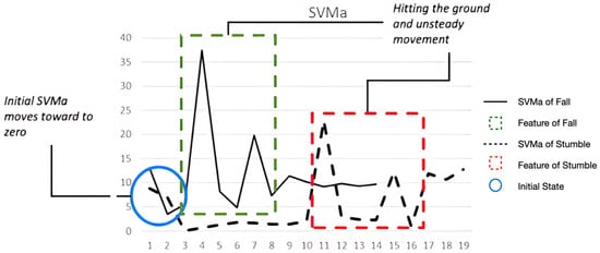 Figure 6 shows examples of SVMa data (i.e., SVM of accelerometer data) for the fall and stumble events. Although the two polylines have different magnitudes and time spans, they resemble each other in terms of patterns, which may lead to misidentification. Both fall from height and stumble are initiated with a fall, resulting in SVMa values closer to zero first. Then, when the subjects hit the ground either because of a fall from height or a stumble, SVMa increases abruptly and reaches its peak owing to the counterforce produced by the ground and, finally, follows the patterns corresponding to unsteady movements.