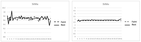 Suppose the subjects did maintain complete stillness during the experiments (i.e., all 10 comas were true comas), and GRU-S did underperform HER-S. The situations that caused GRU-S to fail in identifying comas were those in which the subjects pretended to faint by gradually sitting down first before entering the coma. Figure 7 shows comparisons of SVMa and SVMo (SVM of rotation angle) between the fainted-while-sitting and sitting-and-resting poses of a subject over a 4 s timeframe. The resemblance between the two situations makes it difficult to distinguish between them based on inertial data alone. However, the two situations did not resemble each other over longer periods (e.g., 30 s) because the subjects tended to move slightly when resting unless they were asleep. Thus, one way to distinguish the fainted-while-sitting situation from the sitting-and-resting situation is by providing the model with a higher-level decision-making mechanism based on the observation of a longer timeframe. For example, the current system generates a detection label every 2 s. Monitoring a human who has really fainted while sitting for a minute would more likely result in a steady series of 30 coma labels. Meanwhile, monitoring a sitting and resting human would more likely result in a few safe labels among coma labels because of slightly unavoidable movements. The difference between the two patterns over a longer timeframe could increase the feasibility of distinguishing between the corresponding situations.