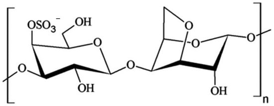 Ultrapure carrageenan is not always necessary to achieve the stated goals. In particular, semi-processed/semi-refined carrageenan is widely produced in various industries, including use as an additive in pet food and dairy products []. Carrageenan is also known to have a high molecular weight with an average molecular mass of about 1000 kDa or 106 g per mole []. Kappa-carrageenan has a linear arrangement of monomers, namely D-galactose-4-sulfate and 3,6-anhydro-D-galactose. The half-sulfate moieties in the carrageenan structure make it a strong anionic biopolymer [].