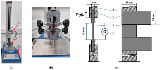 Mechanical stand for strain sensor testing with samples: (a) view of the mechanical testbench, where A—force sensor, B—clamps, C—manual control panel; (b) sample fixing clamps; (c) schematic representation of experiment: a—clamps, b—electrodes, c—carrageenan film, d—multimeter.