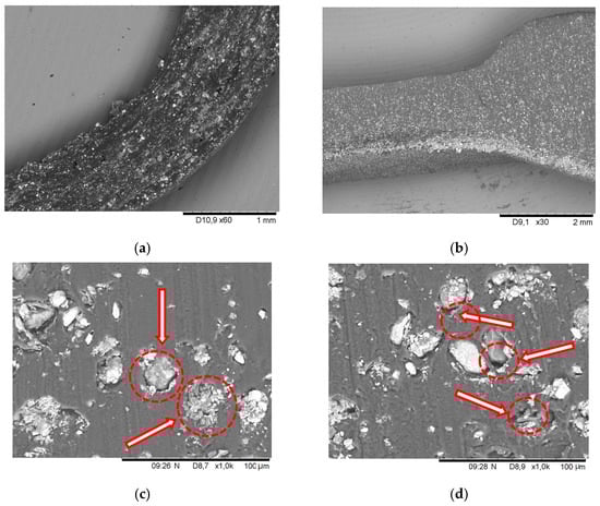 As seen in the micrographs, the structure of the films is complicated. Unseen iron (III) oxide was selected as the industrial pigment for the manufacturing of the film. This selection resulted in iron (III) oxide particles of various sizes, and some of them are also broken into smaller particles, as seen from the micrograph in Figure 4c. We observed some air gaps around most iron oxide particles (Figure 4d). These air gaps affect the initial contact of iron (III) oxide particles with conductive biopolymer film and determine the value of the initial measured resistance. It is obvious that this contact changes when the product is stretched. It is very likely that the resistance will decrease just before the rupture of such a film as a result of the increased contact between the iron (III) oxide particles. We observed such phenomena but did not include these data for the calculations and represented the most linear parts of the applied force curves that met the requirements for force sensors.