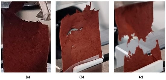 View of films damaged by the applied force. (a) Broken carrageenan film, the composition with 0.5 mL of glycerol and 3 g of iron (III) oxide; (b) sample with 0.05 g of iron (III) oxide; (c) cracked specimen of carrageenan film, the composition with 3 mL of glycerol.