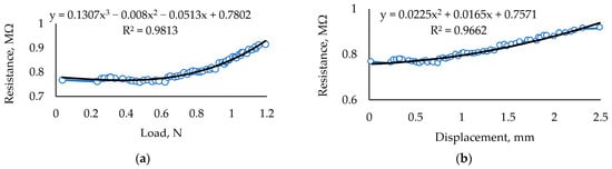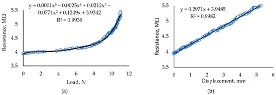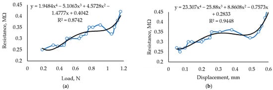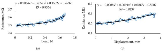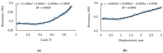 Investigation of the sample with 30 mL carrageenan + 0.5 mL glycerol + 0.05 g Fe2O3; sample aged 5 months. (a) Dependence of measured resistance on the applied load. (b) The dependence of measured resistance on displacement resulting from the applied load.