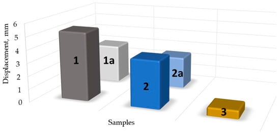 Thus, evaluating the experimental data presented in Figure 6, Figure 7, Figure 8, Figure 9 and Figure 10, it can be seen that the film produced can be applied as a film for a force sensor, but some problems are posed for the repeatability of the developed product. Carrageenan biopolymer film enriched by glycerol plasticizer and iron (III) oxide is sensitive to the proportions of these few simple compounds and the aging process of the prepared composition. Figure 11 compares the maximum displacement (stretch) of all samples tested until they were broken. As seen from Figure 10, glycerol hinders the quality of carrageenan molecules’ binding.