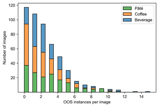 Table 1 shows the distribution of the images and OOS instances for different store sections. Each store section is represented by approximately 170 images which contain from 322 to 446 OOS instances. Whereas images from the beverage and coffee sections display shelves with twice as many normal class instances as front instances, images from the pâté section have an even ratio of instances of both classes. The average count of OOS instances in an image ranges from 1.8 to 2.8 for different store sections, making a total average of 2.4 OOSs per image across the entire dataset. In particular, Figure 3 illustrates the distribution of OOS instances per image. The number of OOS instances varies from zero to 15, 10, and 11 in the beverage, coffee, and pâté sections, respectively. In general, the number of images decreases exponentially with a linear increase in the number of OOS instances in an image.