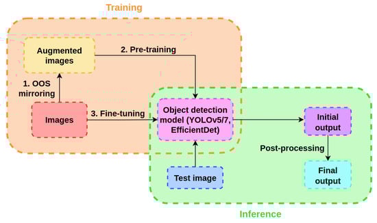 The proposed OOS-detection method is illustrated in Figure 4. We divide our method into two main parts: a training section and an inference section. First, a new augmentation procedure suitable for OOS detection is applied to the original shelf images that contain OOSs to produce augmented shelf images as follows. A randomly selected OOS instance from an original image is duplicated and mirrored horizontally, either to the left or right, thus enlarging itself over nearby products. The proposed OOS mirroring augmentation technique is suitable for OOS detection in images for two reasons. First, the mirroring technique realistically demonstrates a real-world process in which various shoppers take products from the same shelf throughout the working day. Second, usual data augmentation techniques, such as image translation and scale shift, change the absolute location of OOS instances in images but, unlike the proposed mirroring augmentation, do not alter the shape of the instances. An object-detection model trained using images produced by the proposed mirroring technique may benefit from extended instances to achieve a better localization performance.