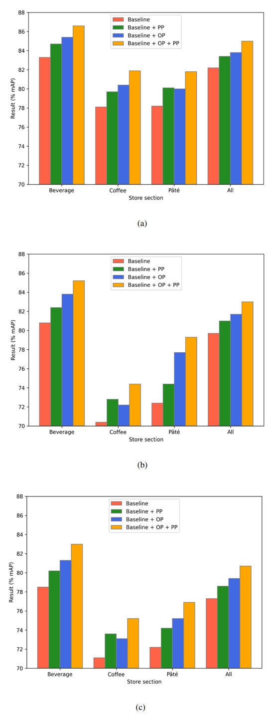 The ablation study in Figure 6 shows the results obtained after applying the proposed post-processing technique to the baseline models and the optimally pre-trained models for each store section (e.g., the YOLOv5 model pre-trained on 100 epochs and later fine-tuned using beverage section data). The results achieved without post-processing are taken from Table 4 and put next to the post-processed results for a clear comparison. Post-processing of the results obtained with the baseline models trained on either a particular store section data or all of the data provided an improvement in the result ranging from 1.2% to 1.9%, from 1.3% to 2.4%, and from 1.3% to 2.5% for the YOLOv5, YOLOv7, and EfficientDet models, respectively. When the post-processing technique was applied to the optimally pre-trained models, the results improved from 1.2% to 1.8%, from 1.3% to 2.2%, and from 1.3% to 2.1% for the YOLOv5, YOLOv7, and EfficientDet models, respectively. Again, each of the YOLOv5 models achieved a higher result than the corresponding YOLOv7 and EfficientDet models.