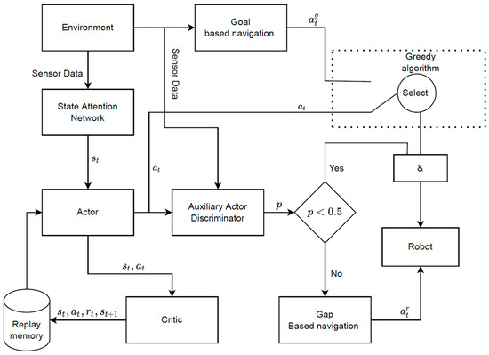 The modified SAC model included a SAN for state learning, and an auxiliary action discriminator for collision probability calculation (Figure 2). It introduced prior knowledge to propose goal-based and gap-based navigation strategies to guide the learning strategies. Raw data from the LiDAR sensor and inertial measurement unit were aligned using a SAN based on an attention mechanism to a uniform state (st). It is hard to prepare enough data to train neural networks when robots are exploring unknown environments. A replay memory D was applied to store experience (s, a, s′, r) to train the neural network by randomly sampling data. During the training phase, the robot moved randomly in unknown environments and generated a lot of collision data, which can make the model fall into local best. An AAD based on the RVO algorithm was developed to calculate the probability of a collision for the current action and reduce the number of collisions. With the help of prior knowledge, neural networks can quickly converge to an optimal action strategy.