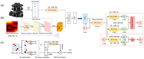 The state representation is critical in an autonomous driving task using DRL with multi-sensor data. For path planning tasks, the state space contains information related to the robot’s own state (e.g., speed, position, orientation angle) and the environment (e.g., obstacles). The input of the SAN includes the vector-based states and the image-based states. In this work, the vector-based states included the robot position, velocity, and distance to the target point. The orientation angle and the image-based states were represented by the LiDAR measurements using a signed distance field algorithm (Figure 3a).