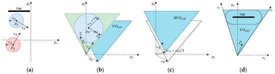 where is the Minkowski sum of two points sets in A and B, −A denotes the robot A reflects in its references point, and denotes the ray with a starting point of p and in the direction of v. In order to avoid collision with obstacles, robot A should choose a speed outside the VO area (). The reciprocal velocity obstacle (RVO) was calculated to reduce oscillations of the VO method (Equation (16)). The RVO was translated geometrically from with a vector , and an apex at (Figure 4c).