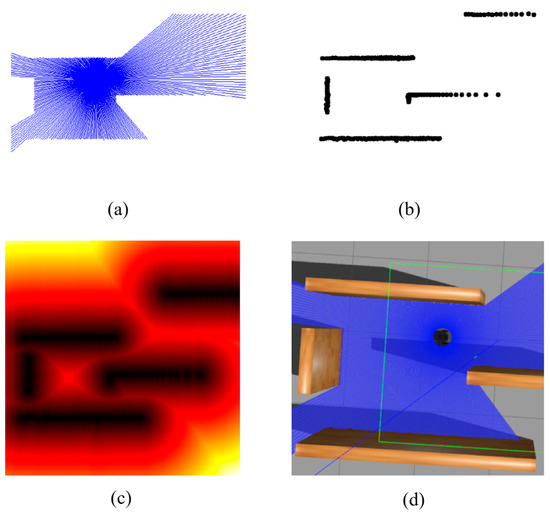 Graphical representation of radar data in process: (a) Represent the radar data in images, (b) extract the obstacle boundary, (c) calculate the distance obstacle map using the signed distance field algorithm, and (d) show in Gazebo environment. (a) Current LiDar data, (b) Extract obstacles, (c) Signed Distance Field, and (d) Gazebo environment.