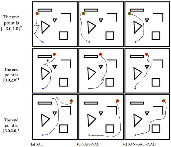 The training phase and generalization of SAC, SAN+SAC, and SAN+SAC+AAD models were compared, and the parameters used in training were summarized in Table 1. In Environemnt I, the models were trained until the average reward of the smart car was stable, and the robot trajectories are shown in Figure 7. The figure shows that those three methods can guide the robot to the end point without collision. In general, the robot can move in the best trajectory in the SAN+SAC+AAD model. The robot can travel in a shorter path when it has learned heuristic knowledge.