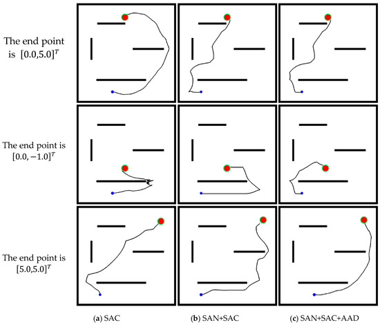 Nine trajectories that the robot obtained by using (a) SAC, (b) SAN+SAC, and (c) SAN+SAC+AAD models for three different end points in Environment I, in which the blue dot denotes the start point, the red circle in the upper right corner is the end point, and the black areas are four walls and obstacles.
