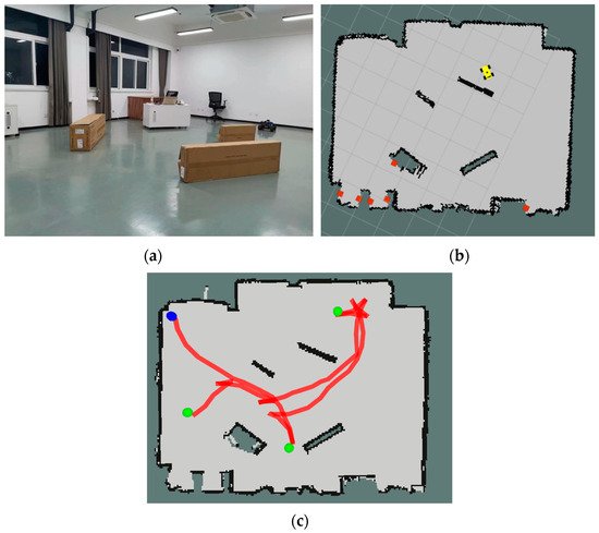 (a) Real scenario, (b) a map created using the Gmapping algorithm, (c) robot trajectory, in which the blue point is the starting point, and the green point is the target point.