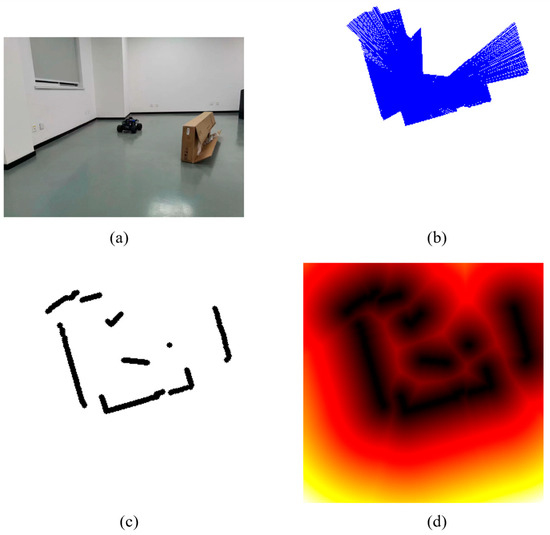Visualization of LiDAR data using the SAN module in a real scenario. (a) Real Scene, (b) LiDAR data, (c) Obstacle Information, and (d) Signed Distance Field.