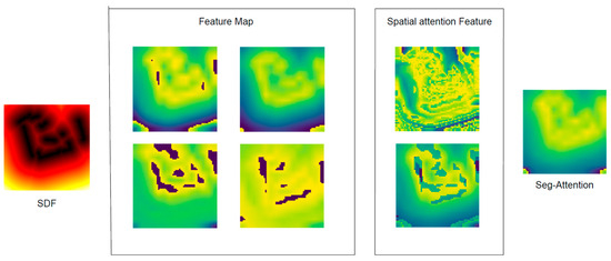 Using the SAN module, the robot collected the LiDAR data and extracted the obstacle information to obtain SDF picture (Figure 12). The feature map focusses on safe paths and obstacles, and it makes good use of the distance information provided by the SDF map (Figure 13).