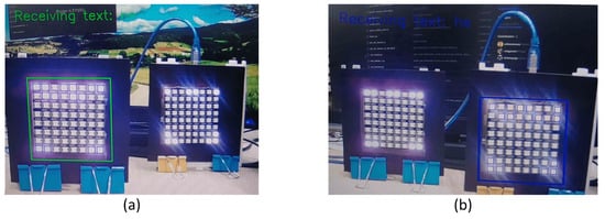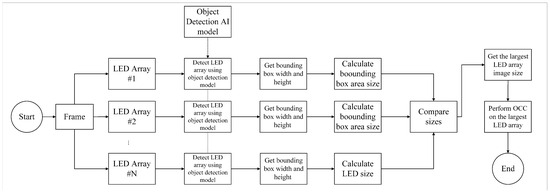 After successfully detecting both LED arrays, the system proceeded to evaluate the area sizes of their respective bounding boxes. This comparison was crucial for determining which LED array engaged in communication with the receiver. A bounding box with a larger area was selected as the target for data transmission. This approach ensures a dynamic and adaptable system that intelligently regulates the interchangeability of LED arrays based on their relative sizes and distances from the camera. The overall process, illustrated in Figure 8, represents a sophisticated approach to optimizing data communication in scenarios with multiple LED arrays.