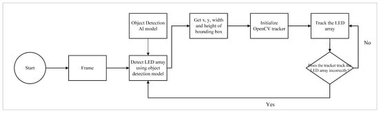 On the receiver side, the camera captures multiple LED array transmitters. Achieving accurate tracking of each LED matrix requires the combined use of the YOLOv8 object detection model and OpenCV tracker. The YOLOv8 object detection model ensures reliable initialization when detecting objects. Consequently, in this scheme, the YOLOv8 model is employed to generate regions of interest (ROIs) on the LED matrix transmitters. Given that the YOLOv8 object detection model consumes considerable resources and exhibits relatively intensive processing demands, especially with moving objects, the OpenCV tracker is employed to monitor the movement of the LED matrix transmitters. OpenCV offers several lightweight trackers capable of tracing position changes in transmitters. However, a disadvantage of using this tracker is that the tracker size may fluctuate during continuous tracking. To mitigate this issue, both the YOLOv8 model and the OpenCV tracker are used simultaneously. This dual approach ensures that the ROI maintains its shape and does not undergo undesired enlargements or reductions throughout the tracking process. The overall detection approach is depicted in Figure 4.
