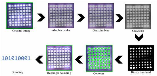 After grayscale transformation, a binary thresholding method is employed to convert the frame to a binary representation. Pixels with intensities exceeding a certain threshold are assigned one value (typically 255 for white), while pixels below the threshold are assigned another value (usually 0 for black). This thresholding process yields several shapes. The contours of the shapes are derived and bounded within rectangular shapes. Only rectangular shapes that fall within predetermined sizes are considered. The final step involves the decoding process. Decoding the LEDs entails determining the position of the LEDs in one row by measuring the distances between the rectangular shapes. The distances between the LEDs can be determined by calculating the width of the rectangular shape and the distance between one shape and another. The overall frame processing is depicted in Figure 5.