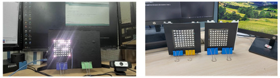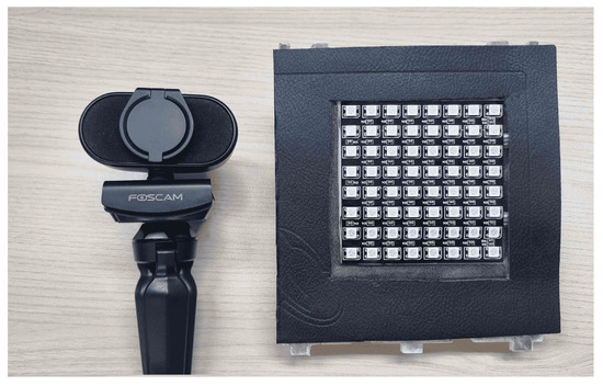 The experiment involved employing two LED arrays positioned in parallel along the x-axis in front of the camera. Both LED arrays were of identical size, and each LED array comprised 64 LEDs on the board, which were arranged in an 8 × 8 matrix. In this setup, as illustrated in Figure 3, the LED sequence number and identifier were assigned to the first and last rows, while the second row was used to transmit text data. OOK modulation was used to map the data on the transmitter row. On the receiver side, a camera was used to capture both LED arrays. All hardwares used in this experiment are depicted in Figure 7.