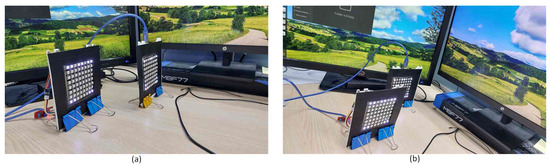 (a) A green square tracker on the left-hand side LED transmitter shows that transmission is in progress, while (b) a blue square tracker on the right-hand side LED transmitter shows that transmission is in progress.