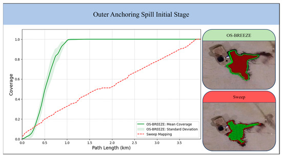 The experimental results for the Outer Anchoring scenario are visualized in Figure 6, which compares the Sweep method with the OS-BREEZE. These results illustrate the differences in efficiency and coverage between the two methods through both graphical and visual data. OS-BREEZE is notable for its swift coverage rate and shorter path length in both the initial and advanced stages, suggesting a higher efficiency. In contrast, the Sweep method presents a slower coverage rate, indicating the need for a longer path to achieve similar coverage. The initial stage results specifically highlight OS-BREEZE’s ability to fully cover the area with a path, while Sweep requires about , and this efficiency remains apparent despite the SD. In the advanced stage, OS-BREEZE maintains its lead with a path length of about , in contrast to the Sweep’s substantially long path.