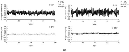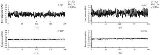 Figure 15 presents the pore pressure for different horizontal distances, and the horizontal distance is the distance between two measuring points (sensors) located on the same horizontal plane on the pipe. It can be found that under the same wave conditions, the oscillatory amplitudes of pore-water pressure increase with the increase in the horizontal distance, which may be caused by the energy dissipation in the process of wave propagation.