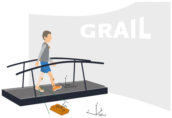 Participants were equipped with five IMUs (MTw Awinda, Movella, Enschede, The Netherlands) attached to the dorsal side of both feet, the anterior aspect of their shanks, and the lower back (L4/5), along with 20 reflective markers for the OMCS. Reflective markers were placed according to the VICON plug-and-gait lower body model []. MT Manager software suite version 2019.2 was used for the data capture of the IMUs. Participants walked on the GRAIL (Gait Real-time Interactive Analysis Lab, (Motek Medical, Amsterdam, The Netherlands)), an instrumented treadmill with an eight-camera OMCS (VICON, Oxford, UK), embedded force plates (Motek Medical, Amsterdam, The Netherlands), and a wide (180°) circular screen in front of the treadmill, creating a virtual environment. The IMU and OMCS both recorded at a sample frequency of 100 Hz, while the force plates operated at 1000 Hz. All systems were time-synchronized by a high–low pulse, with the OMCS serving as master.