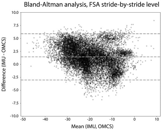 Bland–Altman analysis of the FSA (degrees) of all strides of all participants. The difference between measures is calculated as IMU-based FSA—OMCS-based FSA.