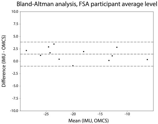 Bland–Altman analysis of the mean FSA (degrees) per participant. The difference between measures is calculated as mean IMU-based FSA—mean OMCS-based FSA.