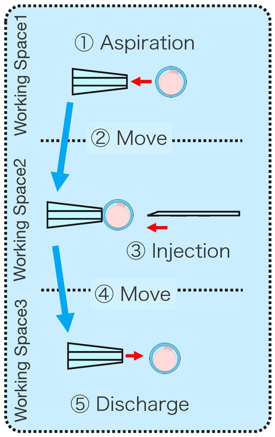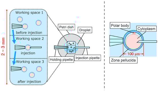 Intracytoplasmic sperm injection (ICSI) is the most popular method of insemination worldwide. In the field of assisted reproductive medicine, ICSI is particularly effective for male infertility and has been widely adopted because of its high incidence rate [,]. However, ICSI generally requires the direct manipulation of oocytes and sperm under an optical microscope, which is a complicated and delicate operation necessitating high skill. In addition, oocytes are damaged by osmotic pressure during cell manipulation. Therefore, ICSI requires efficient manipulation in a short time. The ICSI procedure is conducted as follows. First, the pre-injected oocyte in workspace 1 in Figure 1 is aspirated using a holding pipette and moved to workspace 2. The cells are then rotated in workspace 2, the polar body is moved to the 12 or 6 o’clock directions, an injection pipette is injected into the cytoplasm of the oocyte, and the sperm are injected. The cells are rotated to avoid damage to the spindles near the polar body. High-resolution images are required to observe the microscopic polar bodies and sperm. The holding pipette is then moved to workspace 3, and the oocyte is ejected [,]. The reasons why the ICSI operation is difficult and inefficient are explained from two aspects: the presenting image and the manipulation device. In terms of the presentation image, there is a lack of depth information and an inability to present a wide-area high-resolution image. The rotation and injection of cells requires high-precision work, and the focus position must be adjusted along the depth direction to observe details such as the position of the polar bodies and nuclei of the cells in the high-resolution image. In addition, because cells have individual differences, and the shapes of the cells and polar bodies differ [], conventional optical microscopes require the operator to change the light intensity and lenses to change the field of view according to the work stage. Observing the three-dimensional trajectories of particles can be challenging due to the limited depth of field of optical microscopes []. Certain confocal laser microscopes are capable of three-dimensional (3D) measurements to acquire depth information [], and several inline holographic microscopes can acquire 3D information of a sample by transmitting light in a noncontact and nondestructive manner. In particular, there are many studies on 3D particle-tracking methods using digital holography []. For instance, a clustering-based particle detection method for digital holography has been proposed [], as well as a method for determining the 3D location of multiple biological targets based on digital holography []. However, confocal laser microscopy is not suitable for microinjection owing to the requirement of scanning to measure the depth information and the inability to measure moving cells. Further, inline holographic microscopes are not suitable for microinjection because the conjugate image of the transmitted zero-order light and the object light reduces the resolution of the reproduced image. Although the resolution can be improved using synthetic aperture or pixel super-resolution techniques, multiple images are required; therefore, neither microscope can be introduced to the microinjection process, which requires a spatial resolution of a few micrometers [,], a field of view of 3 × 3 mm, and real-time visual feedback. Therefore, we have developed a field-expanding microscope that can capture both a wide field of view and high-resolution images using high-speed viewpoint movements with a galvano-mirror [,]. Furthermore, we have developed a microscopy system that uses a field-expanding microscope for the real-time 3D presentation of oocytes and manipulators on a holographic display []. However, the operating device is not intuitive because the micromanipulators used to move the pipettes and joysticks used in conventional devices do not correspond to each other in terms of the degrees of freedom (DOFs) of operation. Micromanipulators have 3-DOFs in translation, whereas joysticks have 2-DOFs in translation and 1-DOF in rotation. In addition, the manipulator must switch to an injector during the manipulation to suck and grasp the cells. Although there are examples of biomedical applications using haptic devices, haptic devices are not currently used in ICSI due to the difficulty of the real-time sensing of the three-dimensional position of the oocyte and the contact force during the ICSI process. To simplify these complicated operations, several studies have been conducted to automate cell manipulation. For example, the automation of a simple task, such as picking up and placing small objects, can be achieved by using MEMS micro-grippers with controllable plunge structures []. In particular, the automation of cell rotation, which is a particularly important but difficult operation, has been attempted in several ways [], such as using electric [], magnetic [], sound [,], and light [,] fields. Furthermore, mechanical [] and fluidic contacts [,] have been used to achieve automation. However, although these noncontact rotation methods are suitable for rotating cells at a constant speed, their effects on the developmental process of oocytes have not been evaluated and are risky. Moreover, the light field also has a low power output, which may not be sufficient to rotate the oocytes (>100 μm) or may cause optical damage. Mechanical contact also has the potential for unexpected physical damage [] because of the difference in the rotation method from the way it is performed in an actual ICSI []. In addition, research has been conducted on the automated microinjection of zebrafish as an automated microinjection method [,]. Genome editing has a low success rate and requires a large number of trials, and therefore is suitable for automation, where efficiency is more important than accuracy. However, the application of this technique to ICSI is challe