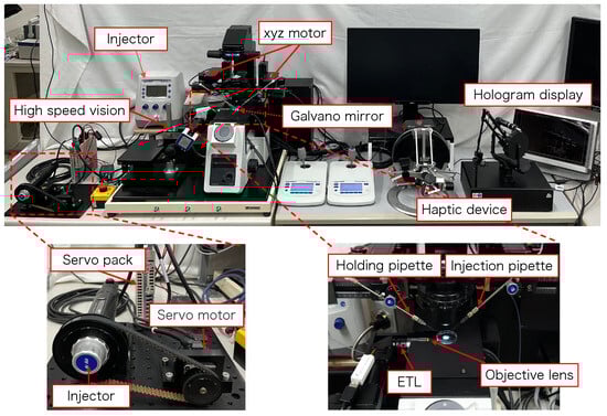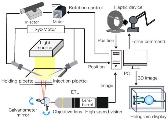Figure 2 shows the configuration of the proposed micromanipulation system and Figure 3 illustrates the system. The system comprises an inverted microscope (IX73, OLYM-PUS), objective lens (LWD95mm, 10X, Mitutoyo, Sakado, Japan), high-speed vision (MQ003MG-CM, Ximea, Lakewood, CA, USA), variable focus lens (EL-10-30-C-VIS-LD-MV, Optotune, Dietikon, Switzerland), lens driver (Lens Driver 4, Optotune, Dietikon, Switzerland), 2-axis galvanometer mirror (6210HSM 6 mm 532 nm, Cambridge Technology, Cambridge, UK), control PC (OS: Windows 10 Home 64bit, CPU: Intel(R) Core(TM) i9-9900KF 3.60 GHz, RAM: 32 GB, GPU: NVIDIA GeForce RTX 2080 SUPER), D/A board (PEX-340416, interface), counter board (PEX-632104, interface), light source (LA-HDF158AS, Hayashirepic Corporation, Tokyo, Japan), joystick-mounted micromanipulator (TransferMan 4r, Eppendorf, Vienna, Austria), microinjector (FemtoJet 4i, Eppendorf, Vienna, Austria), microinjector (CellTram 4r Air, Eppendorf, Vienna, Austria), hologram display (The Looking Glass 15.6 Pro, Looking Glass Factory, New York, NY, USA), haptic device (Phantom Premium 1.5 High Force, 3D Systems, Rock Hill, SC, USA), haptic device (omega.7, Force Dimension, Nyon, Switzerland), servo motor (SGM7A-A5AFA21 Yaskawa, Kitakyushu, Japan), SERVOPACK (SGD7S -R70F00A, Yaskawa, Kitakyushu, Japan), timing belt (HTBN475S5M-100, Misumi, Tokyo, Japan), pulley (HTPB27S5M100-A-P8, HTPB49SM100-B-P41, Misumi, Tokyo, Japan), and optical breadboard (MB2530/M, Thorlabs, Newton, NJ, USA).