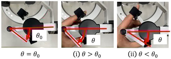 In conventional systems, the cells are aspirated and discharged by rotating the injector and applying positive or negative pressure to the holding pipette. Conventionally, this operation requires the user to change the joystick and injector during the operation, thus rendering the operation cumbersome. In the proposed system, one DOF for grasping the haptic device with a grasping function used to manipulate the holding pipette is allocated to the suction and dispensing of cells. Therefore, the proposed system enables intuitive and efficient manipulation. The rotation of the injector is controlled by a motor that is connected to it via a timing belt. This decision was made because the belt is quiet and easy to maintain. When the haptic device is grasped, the motor rotates in Equation (1) according to the grasping angle of the haptic device, as shown in Figure 4; then, the injector rotates in Equation (2) through the timing belt.